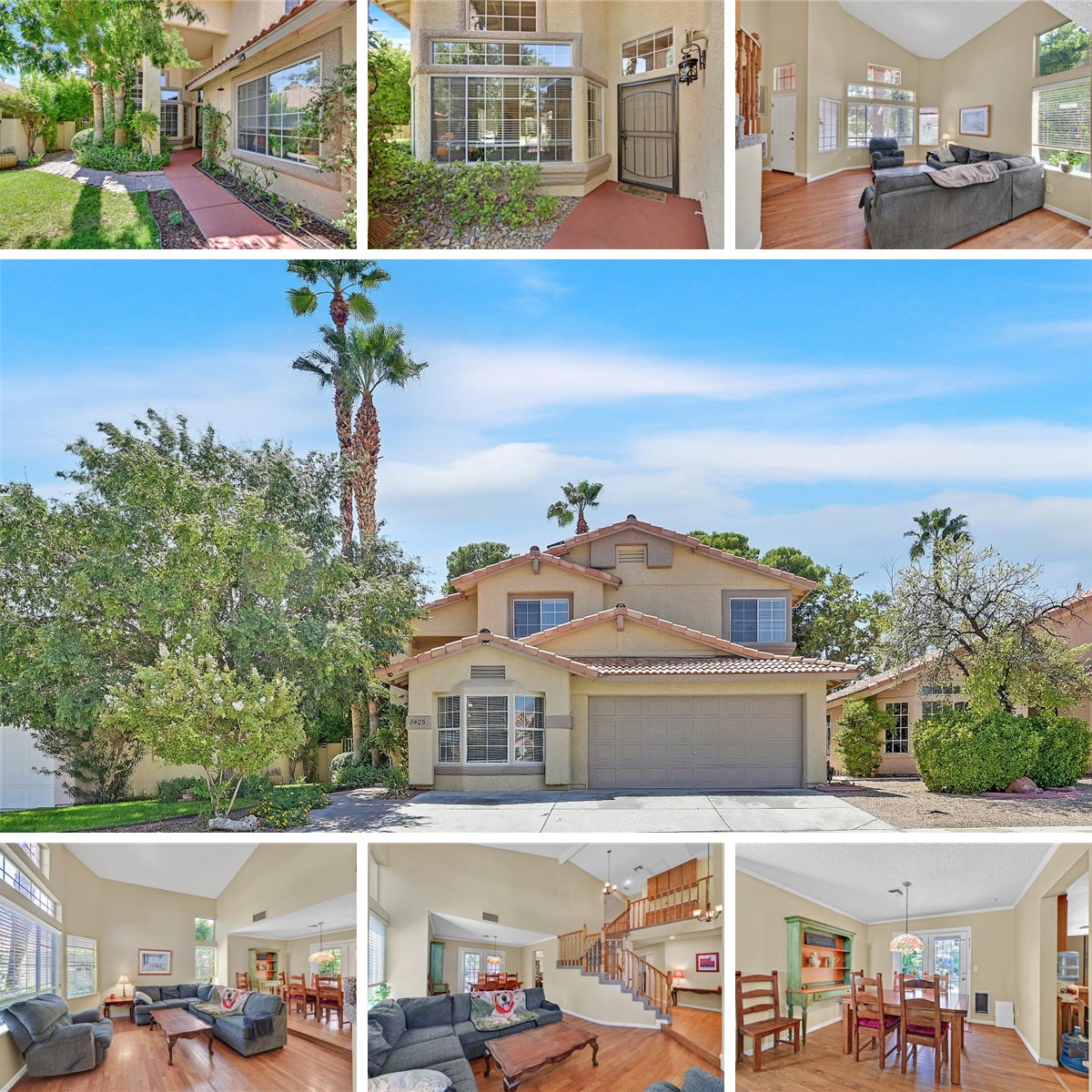 Welcome to beautiful Desert Shores with fabulous lakes, recreation areas, and restaurants! Lovely home with soaring ceilings, hardwood floors in the living areas and kitchen. Bed, 3/4 bath and large den/studio downstairs. Lush landscaping front and rear. Raised garden beds and dog run out back.French doors off the family room and dining room to the exquisite back yard. Large covered patio! Inviting fireplaces in the family room and primary bedroom. Spotless finished garage with epoxied floors. Newer shower enclosures on both the primary and downstairs shower. Newer high efficiency HVAC. 3 car driveway (sellers selected a builder option to make the single car garage a den). Solar lease is $159/mo. Power has been around $15/mo.